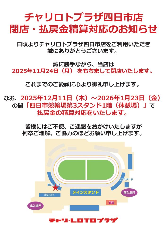 チャリロトプラザ四日市店についてのお知らせ