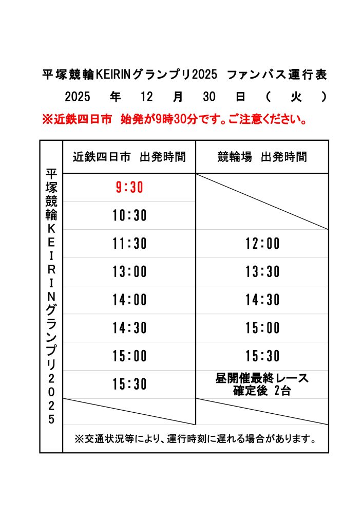 12月30日(火)グランプリ開催日のファンバスダイヤについて